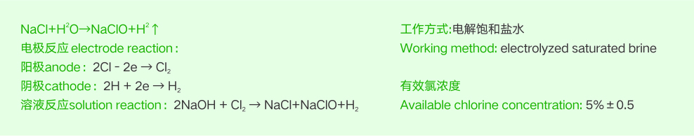 Hic系列的次氯酸鈉發(fā)生器是一套由飽和鹽水(24%-25%)通過(guò)通電電極發(fā)生電化學(xué)反應(yīng)以后生成次氯酸鈉溶液的裝置。其總反應(yīng)表達(dá)如下:
