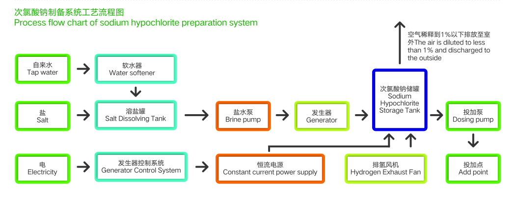 主要構(gòu)成部件: 軟水系統(tǒng)、鹽水精制系統(tǒng)、發(fā)生器系統(tǒng)、電源系統(tǒng)、儀表及控制系統(tǒng)、儲(chǔ)存及脫氫系統(tǒng)、次氯酸鈉投加系統(tǒng)。